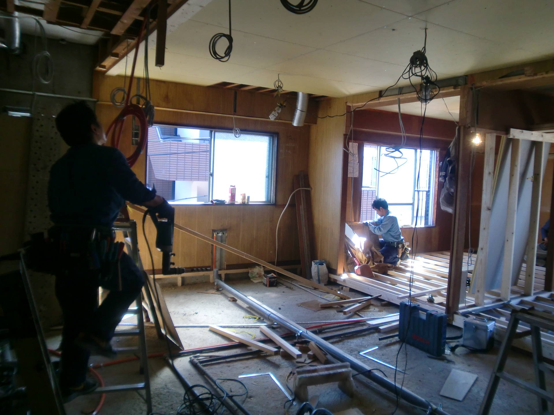 Sビルマンション改修工事 解体完了 2014年10月14日(火) 解体完了。今日は電気屋さんと大工さんが入っています。 玄関から入ってすぐの左側に浴室、洗面、トイレを配置して水回りを集中させます。 窓側の奥にキッチン。排水管に手前が低くなるように勾配がついています。 水回りのリフォームの場合、このような配管勾配がつけられるかどうかが重要です。 リフォーム一覧に戻る 前の記事へ 次の記事へ 最新の投稿 目黒区A邸 地鎮祭 目黒区A邸AP 地盤改良杭工事 目黒区I邸 基礎立ち上がり打設完了 目黒区I邸 配筋工事 品川区M邸 解体完了しました