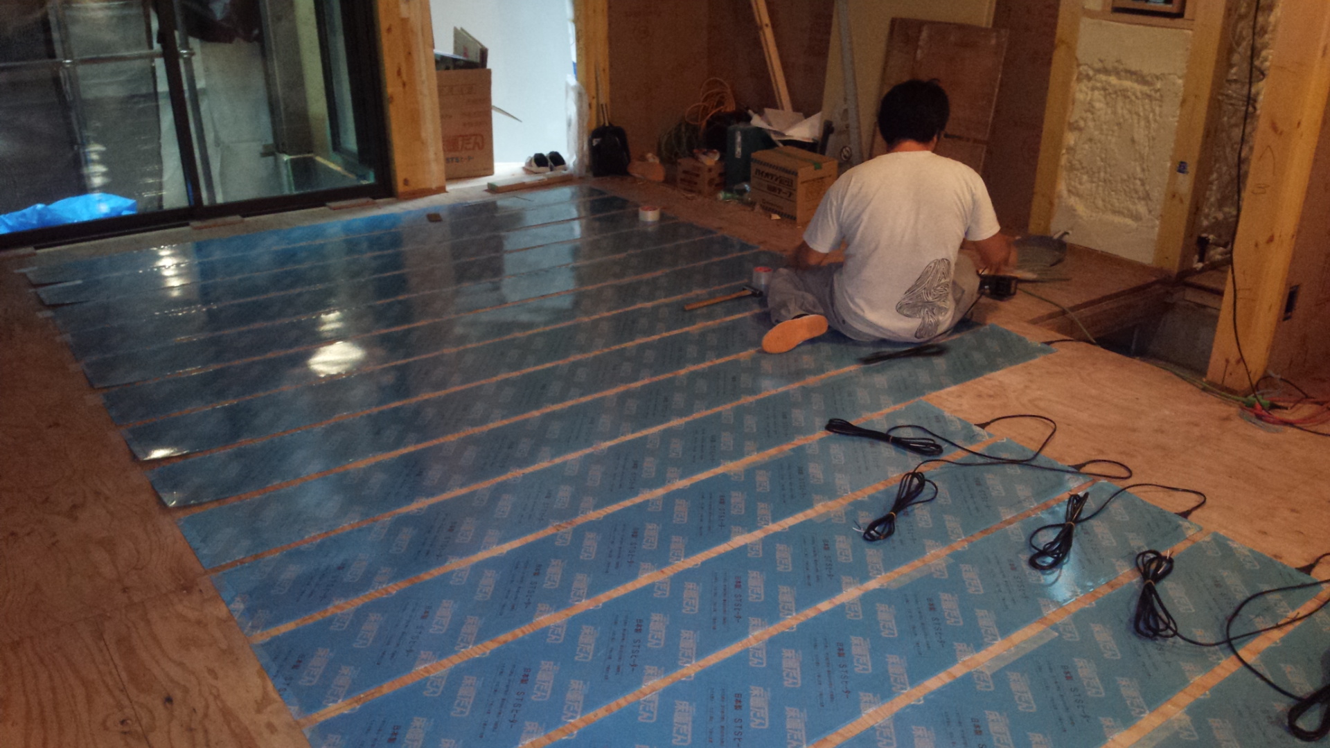 フローリング施工の前に床暖房をいれます。