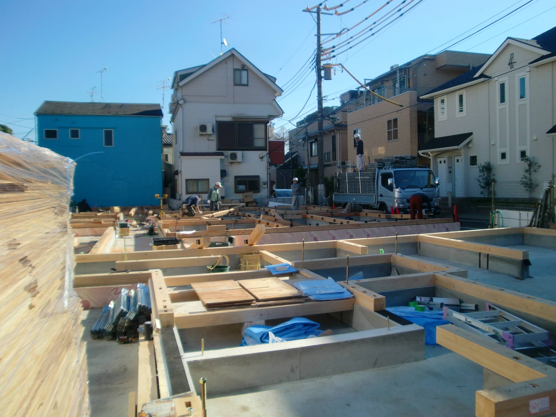M邸共同住宅 いよいよ木工事 2014年12月15日(月) 白くなめらかなベタ基礎が完成すると、いよいよ大工さんの出番です。 週末の上棟にむけて、土台敷きがすすんでいます。 時を同じくして、足場屋さんも到着。 事業用住宅一覧に戻る 前の記事へ 次の記事へ 最新の投稿 目黒区I邸 断熱吹付け工事 目黒区A邸 ベタ基礎完成 目黒区A邸 べた基礎耐圧板 コンクリート打設工事 目黒区A邸 べた基礎配筋工事 目黒区I邸賃貸併用住宅 バルコニー防水工事