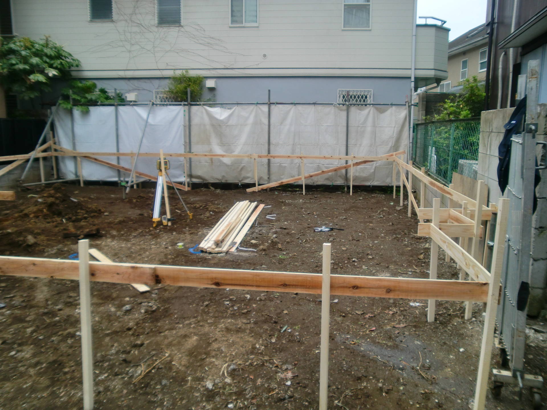 目黒区K邸 遣り方出し 2015年4月20日(月) 本日から基礎工事開始です。遣り方出しは、建物の位置を正確に出して、基礎の水平を出すために杭や貫板(横板)を打っていく重要な作業です。 注文住宅一覧に戻る 前の記事へ 次の記事へ 最新の投稿 目黒区I邸 断熱吹付け工事 目黒区A邸 ベタ基礎完成 目黒区A邸 べた基礎耐圧板 コンクリート打設工事 目黒区A邸 べた基礎配筋工事 目黒区I邸賃貸併用住宅 バルコニー防水工事