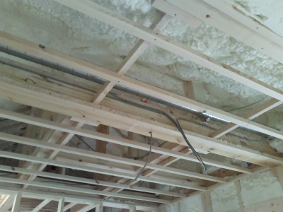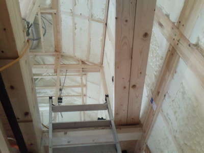 大田区K邸 ウレタン断熱 2015年5月19日(火) 上棟から10日、外壁下地も入ってすっかり家らしくなってきました。 壁の下半分の黄色い薬剤は、天然ヒバ油を原料とした防蟻処理剤です。 外気と接する壁の内側に硬質ウレタン断熱材が吹付けられています。 断熱材の効果は、すきまなく施工することで発揮されるので、現場吹き付けが理にかなっています。 太田区K邸一覧に戻る 前の記事へ 次の記事へ 最新の投稿 目黒区I邸 断熱吹付け工事 目黒区A邸 ベタ基礎完成 目黒区A邸AP 基礎コンクリート打設完了 目黒区A邸AP 鉄骨土台施工 目黒区A邸 べた基礎耐圧板 コンクリート打設工事