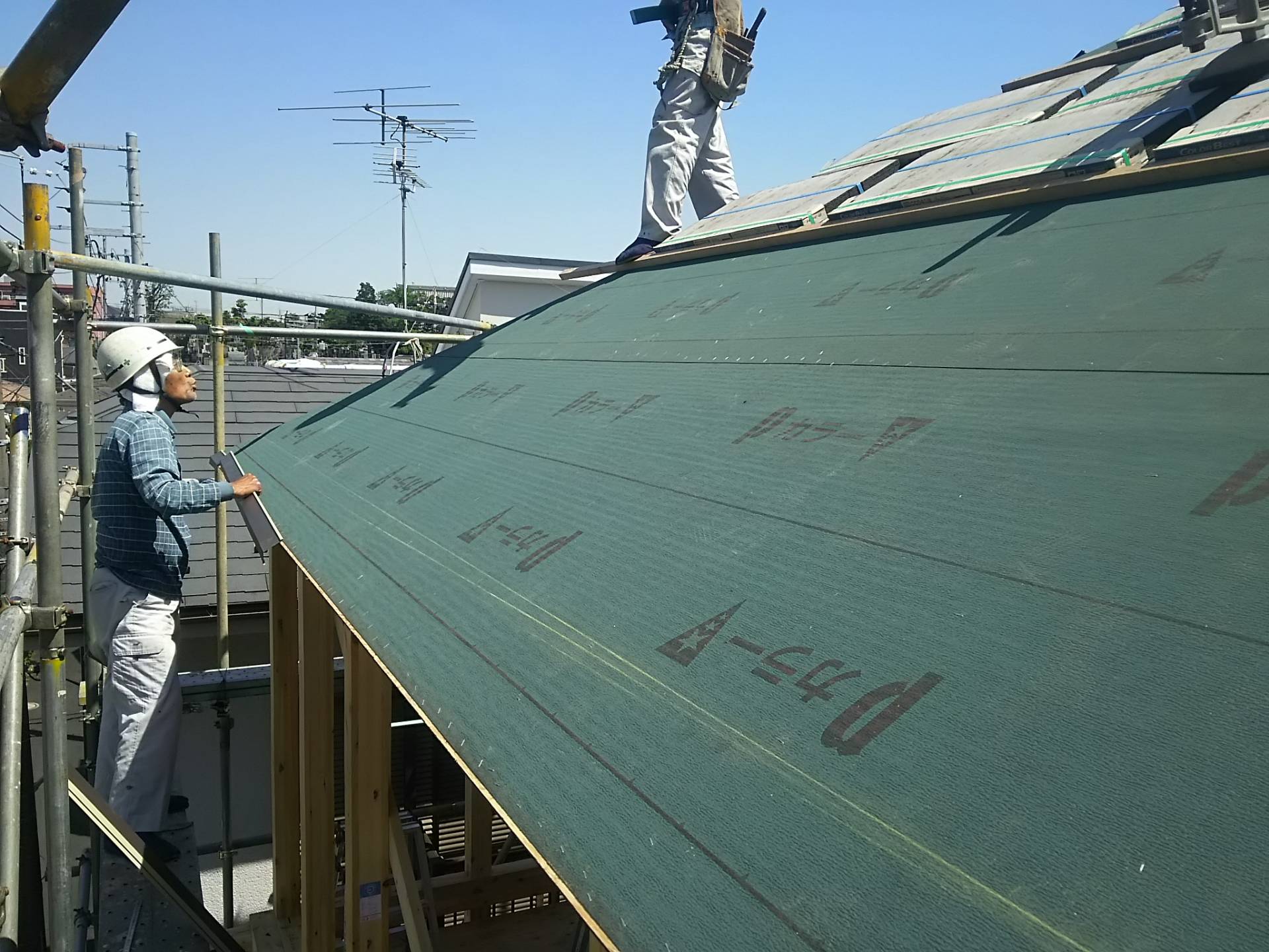 大田区K邸 屋根工事 2015年5月11日(月) 屋根の野地板の上にまずアスファルトルーフィングをタック止めして防水します。 そのうえからコロニアル屋根材を施工していきます。 コロニアル施工完了。雪止めもついています。 DSC_0383 太田区K邸一覧に戻る 前の記事へ 次の記事へ 最新の投稿 目黒区I邸 断熱吹付け工事 目黒区A邸 ベタ基礎完成 目黒区A邸AP 基礎コンクリート打設完了 目黒区A邸AP 鉄骨土台施工 目黒区A邸 べた基礎耐圧板 コンクリート打設工事