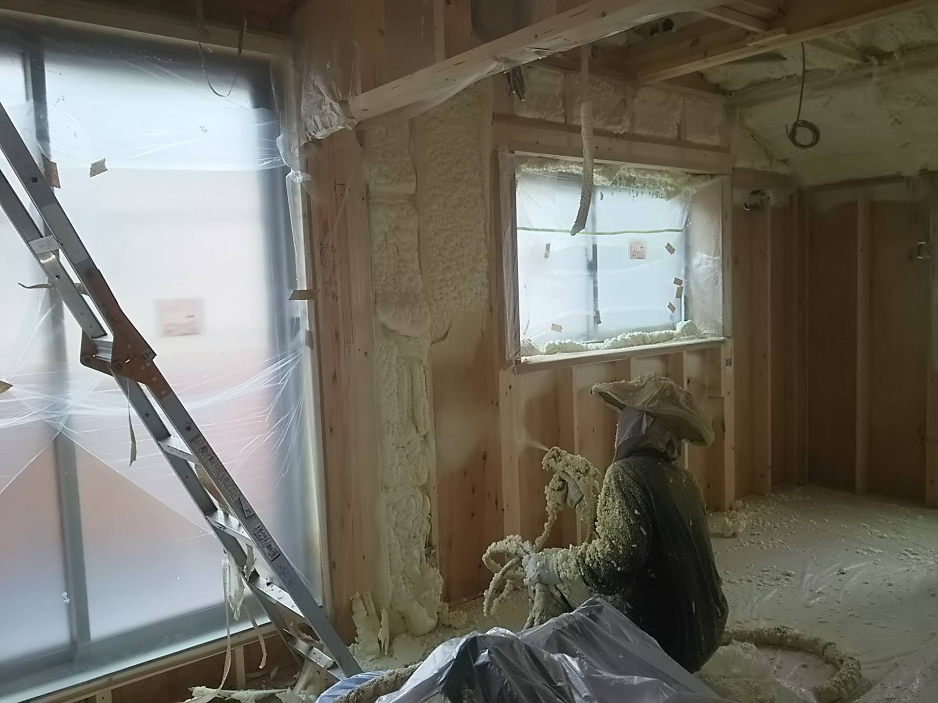 目黒区K邸 ウレタン吹付 2015年5月18日(月) 断熱材の吹付を行っています。 吹付箇所以外は厳重に養生を行い、ウレタンを吹き付けていきます。 空気を含むをみるみるふくらみ、隙間に入りこんでくっつくので、とても気密性が高くなるのが特徴です。 太田区K邸一覧に戻る 前の記事へ 次の記事へ 最新の投稿 目黒区I邸 断熱吹付け工事 目黒区A邸 ベタ基礎完成 目黒区A邸AP 基礎コンクリート打設完了 目黒区A邸AP 鉄骨土台施工 目黒区A邸 べた基礎耐圧板 コンクリート打設工事