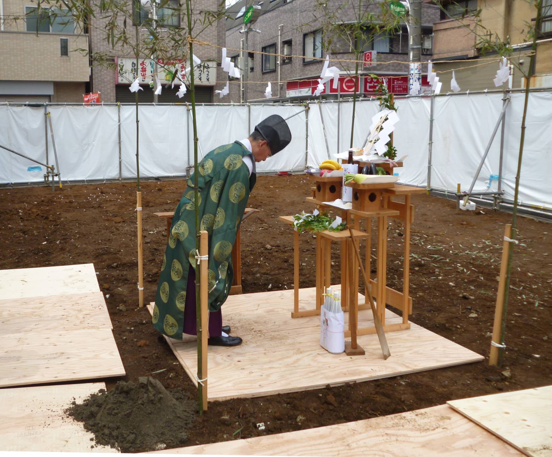 ニコマビル 地鎮祭 2015年6月7日(日) 週末に地鎮祭が執り行われました。 「とこしずめのまつり」ともいわれ、工事の前に土地の神様を鎮め、土地を使わせてもらう許しをもらい、工事の安全を祈願するものです。 事業用住宅一覧に戻る 前の記事へ 次の記事へ 最新の投稿 目黒区I邸 断熱吹付け工事 目黒区A邸 ベタ基礎完成 目黒区A邸AP 基礎コンクリート打設完了 目黒区A邸AP 鉄骨土台施工 目黒区A邸 べた基礎耐圧板 コンクリート打設工事