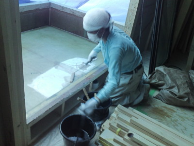 目黒区K邸 FRP防水工事 2015年6月6日(土) ベランダの防水工事です。 石膏ボードの下地の上に溶剤を塗り、このガラスマットを敷き込みながらさらに樹脂溶剤を塗っていきます。 注文住宅一覧に戻る 前の記事へ 次の記事へ 最新の投稿 目黒区I邸 断熱吹付け工事 目黒区A邸 ベタ基礎完成 目黒区A邸AP 基礎コンクリート打設完了 目黒区A邸AP 鉄骨土台施工 目黒区A邸 べた基礎耐圧板 コンクリート打設工事