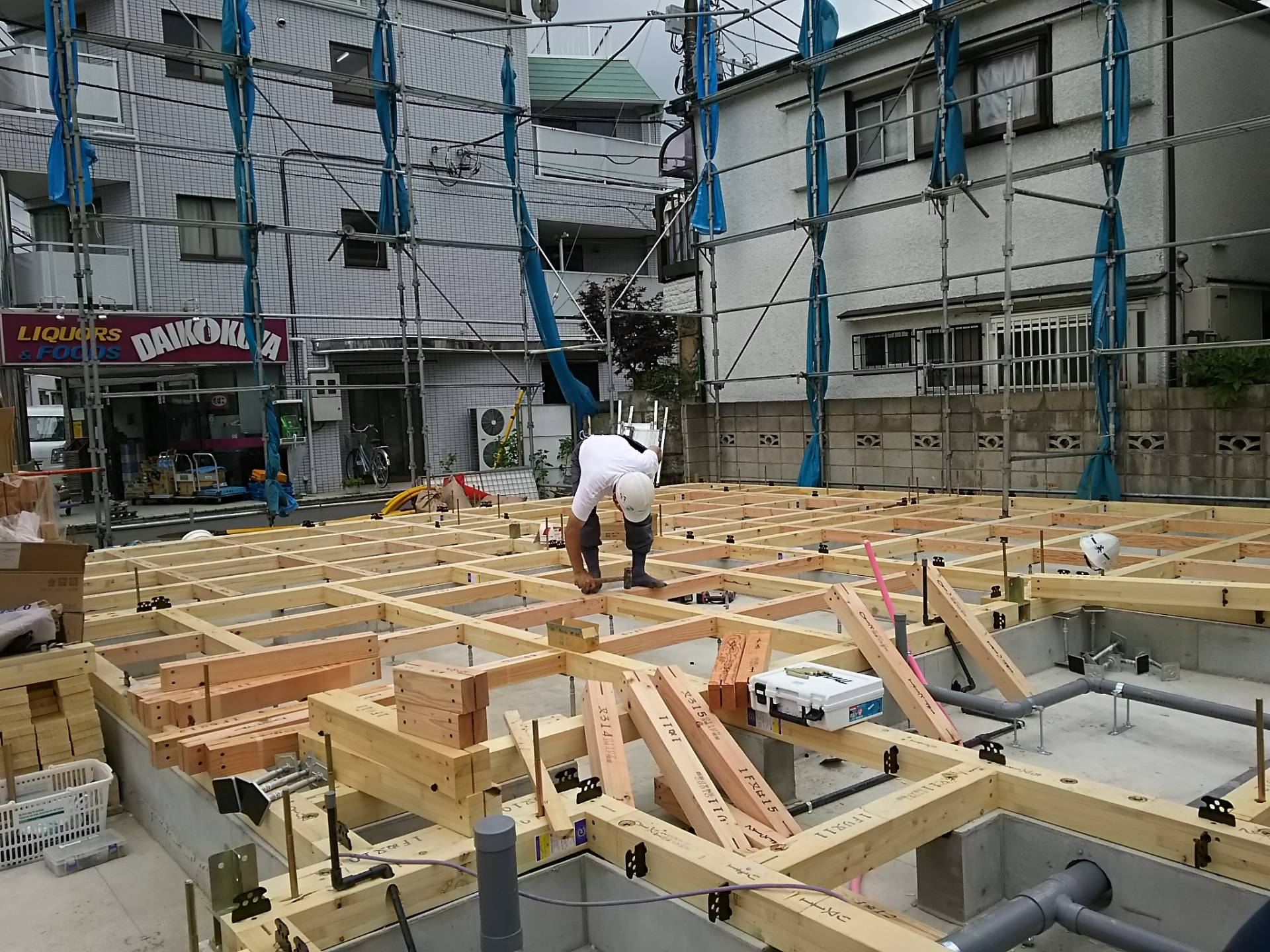 目黒区G邸共同住宅 土台敷き2 2015年6月30日(火) 大きな建物なので土台敷きにも3-4日がかりです。でもほぼ完了! 雨がもってくれればいいですね。。 事業用住宅一覧に戻る 前の記事へ 次の記事へ 最新の投稿 目黒区A邸 地鎮祭 目黒区A邸AP 地盤改良杭工事 目黒区I邸 基礎立ち上がり打設完了 目黒区I邸 配筋工事 品川区M邸 解体完了しました