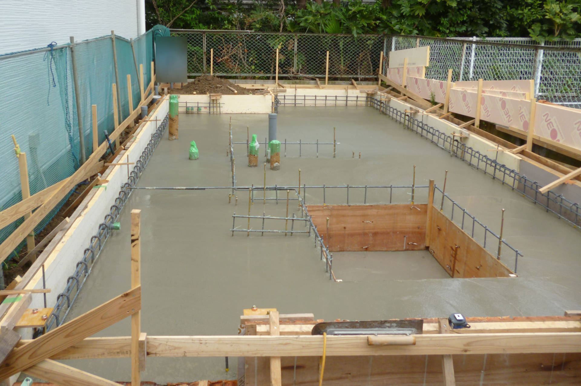 世田谷区K邸 ベタ基礎 2015年9月1日(火) ベタ基礎のコンクリート打設が完了しました。 耐圧盤コンクリートが乾燥すると次は立ち上がりを打ちます。 立ち上がり部分に木枠がたてられています。 世田谷区K邸一覧に戻る 前の記事へ 次の記事へ 最新の投稿 目黒区I邸 断熱吹付け工事 目黒区A邸 ベタ基礎完成 目黒区A邸 べた基礎耐圧板 コンクリート打設工事 目黒区A邸 べた基礎配筋工事 目黒区I邸賃貸併用住宅 バルコニー防水工事