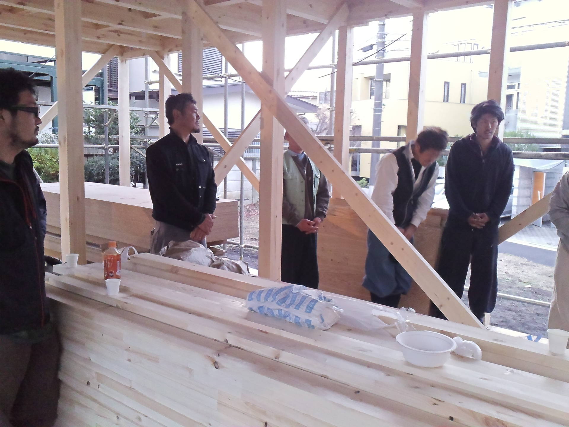 世田谷区Y邸 上棟です 2015年12月25日(金) 今日は上棟式。 大工さんが集結して一気に上棟まですすみます。 棟木に幣束がたてられ、いよいよ上棟式の開始です。 上棟式ではお施主様と職人が改めて顔合わせを兼ねてご挨拶。 上棟のお祝いをして今後の工事の無事を祈ります。 メリークリスマス ☆☆☆ 世田谷区Y邸2一覧に戻る 前の記事へ 次の記事へ 最新の投稿 目黒区I邸 断熱吹付け工事 目黒区A邸 ベタ基礎完成 目黒区A邸 べた基礎耐圧板 コンクリート打設工事 目黒区A邸 べた基礎配筋工事 目黒区I邸賃貸併用住宅 バルコニー防水工事