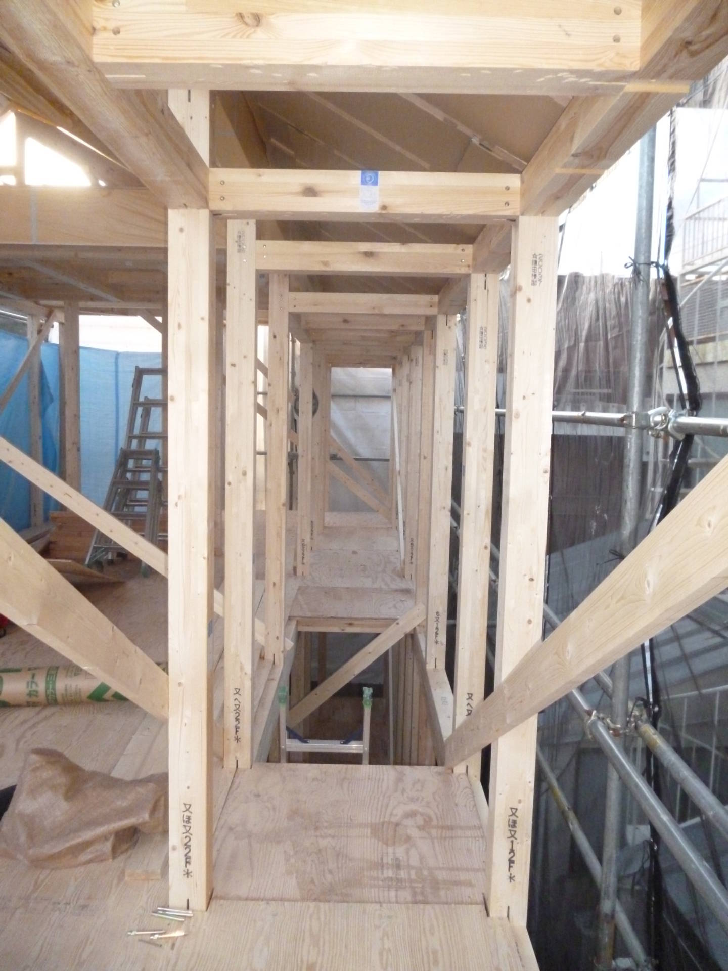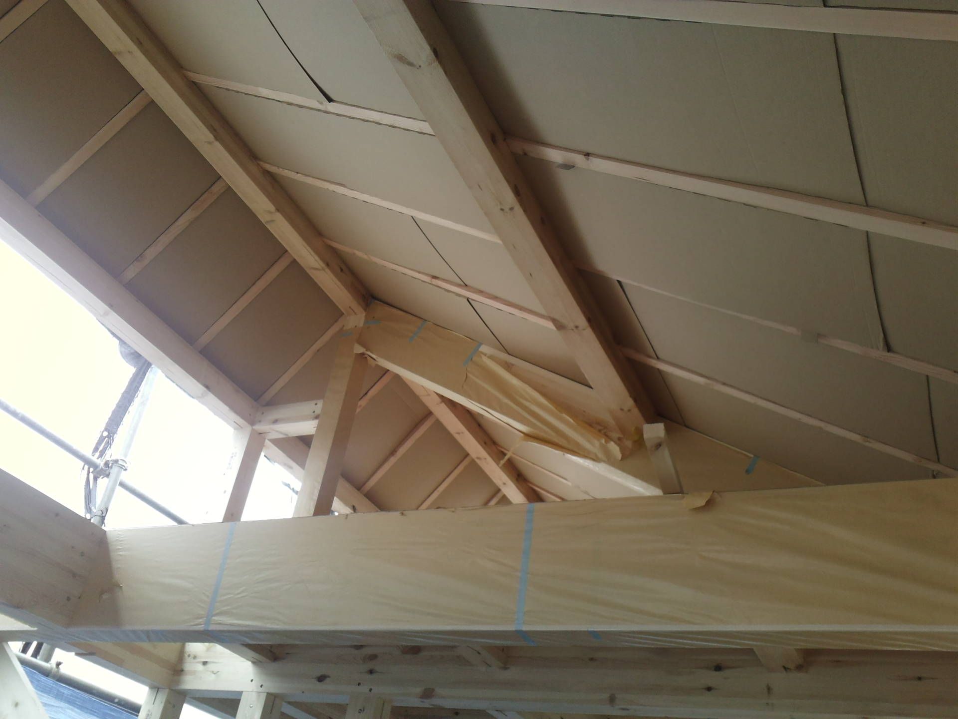 目黒区K邸 上棟です 2016年1月24日(日) 無事に棟上げが完了し、翌日上棟式が行われました。 屋根裏には段ボール製の通気スペーサーが施工されています。 「通気スペーサー」と野地板間が通気層となり、外壁の通気層と連動して、壁体内から上がってくる熱や湿気を棟換気口から排出します。 高気密高断熱構造は通気がしっかりとれていないと快適な空間にはなりません。 一見簡単そうな装置ですが、非常に重要な役割を担っています。 2階です。ここに階段が入ります。 注文住宅一覧に戻る 前の記事へ 次の記事へ 最新の投稿 目黒区I邸 断熱吹付け工事 目黒区A邸 ベタ基礎完成 目黒区A邸 べた基礎耐圧板 コンクリート打設工事 目黒区A邸 べた基礎配筋工事 目黒区I邸賃貸併用住宅 バルコニー防水工事