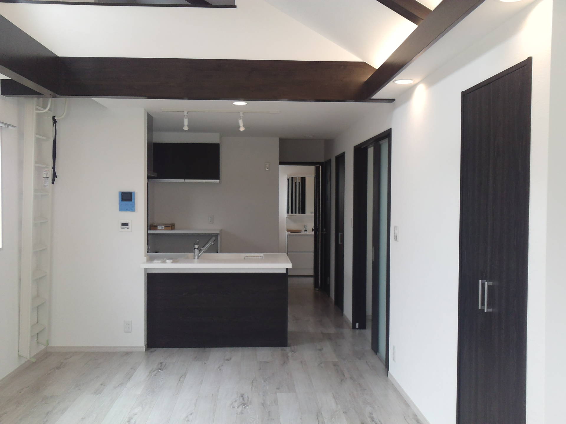 2階のLDKです。白とダークブラウンを基調とした落ち着いた空間。