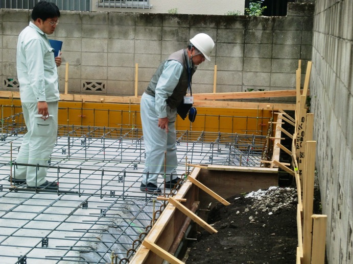 ベタ基礎配筋 2012年6月12日(火) 基礎配筋の施工が完了し、住宅瑕疵担保保険の検査員の方による配筋検査が行われました。鉄筋の太さや間隔が正しく設置されているか確認します。 目黒区大岡山K邸一覧に戻る 前の記事へ 次の記事へ 最新の投稿 目黒区A邸 地鎮祭 目黒区A邸AP 地盤改良杭工事 目黒区I邸 基礎立ち上がり打設完了 目黒区I邸 配筋工事 品川区M邸 解体完了しました