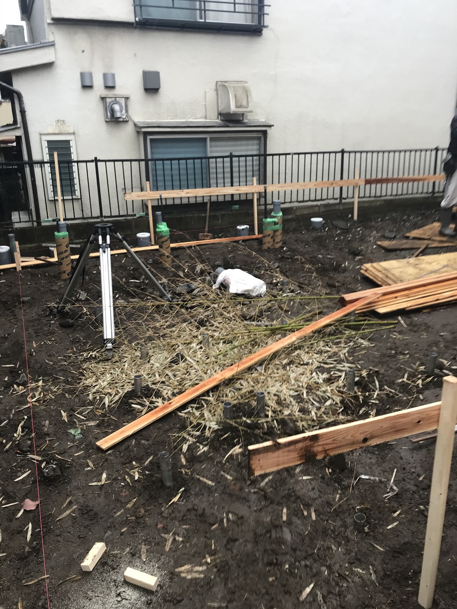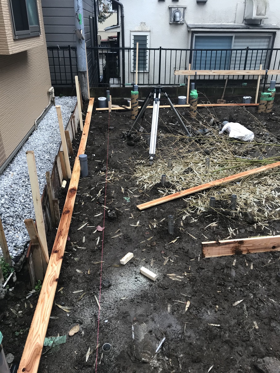 品川区K邸 遣り方出し 2019年11月27日(水) 基礎工事を開始する前に遣り方出しを行います。 建物の外壁の外側に貫板と呼ばれる木板をぐるりと囲むように設置し、正確に建物の位置をきめていきます。 品川区K邸201909一覧に戻る 前の記事へ 次の記事へ 最新の投稿 目黒区I邸 断熱吹付け工事 目黒区A邸 ベタ基礎完成 目黒区A邸 べた基礎耐圧板 コンクリート打設工事 目黒区A邸 べた基礎配筋工事 目黒区I邸賃貸併用住宅 バルコニー防水工事