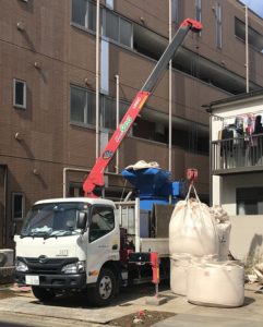 袋に入ったセメントを一つずつコンクリートプラント車に移しいれつくられたセメントミルクが巨大な掘削ドリルのついた重機に送られます。ドリルで地面を支持層まで掘削して、セメントミルクを注入しながら土と攪拌し、柱状のセメントの固まりをつくります。