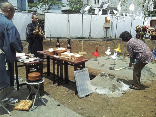 地鎮祭 2012年7月3日(火) 6月30日、無事地鎮祭がとり行われました。こちらは仏式での式典です。土地のお清めと工事の安全を祈願していただきました。 目黒区洗足マンション一覧に戻る 前の記事へ 次の記事へ 最新の投稿 A邸AP 鉄骨造 建方(たてかた) 目黒区I邸 断熱吹付け工事 目黒区A邸 ベタ基礎完成 目黒区A邸AP 基礎コンクリート打設完了 目黒区A邸AP 鉄骨土台施工