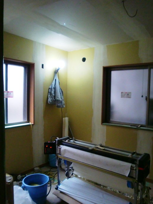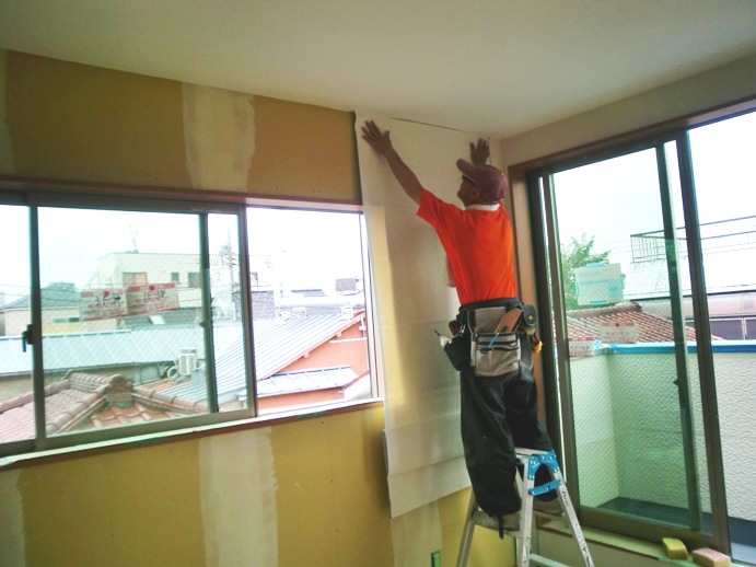 クロス貼り 2012年7月3日(火) クロス屋さんの職人技をみてきました!まず、下の様な機械でミミをカットしながらクロス裏に糊をつけます。 下地のパテ処理箇所の余分な凸凹をへらで掻きとったあと、上端をあわせて貼り付け。このときに一発で真っ直ぐ貼れていまうのが技ですねー! へらで上端を抑えて余分をカッターですーっと切り取ります。 全体を刷毛で軽くおさえながら、 サッシ横と そして下も。。 次々といろんな道具を手早く使い分けて、とても綺麗な仕上がりです! 品川区荏原K邸一覧に戻る 前の記事へ 次の記事へ 最新の投稿 目黒区I邸 断熱吹付け工事 目黒区A邸 ベタ基礎完成 目黒区A邸AP 基礎コンクリート打設完了 目黒区A邸AP 鉄骨土台施工 目黒区A邸 べた基礎耐圧板 コンクリート打設工事