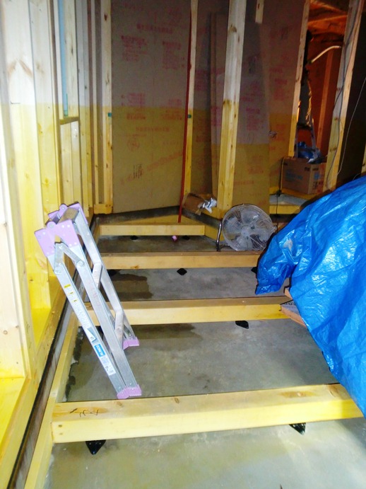 一階の半分は応接スペースとなるので、床をはるための大引きに金物の足をつけてコンクリート基礎の上に設置しています。