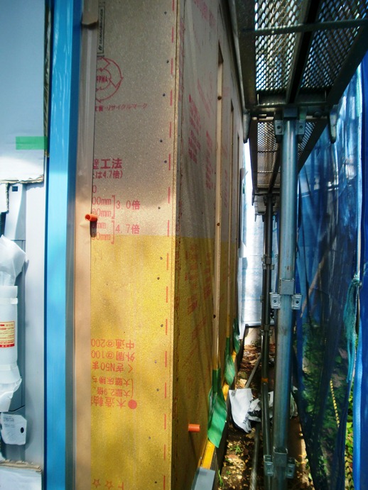 柱や壁が黄色く塗られているのは防蟻処理剤です。当社では天然ひば油を主成分とした人体に優しい原料を用いた処理剤を採用しています。