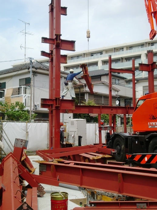 建込開始 2012年9月6日(木) 本日から鉄骨の建込が開始されました。 お昼前頃にはここまで建ちました。これから来週の上棟まで1週間かけて組み上げます。 目黒区洗足マンション一覧に戻る 前の記事へ 次の記事へ 最新の投稿 目黒区I邸 断熱吹付け工事 目黒区A邸 ベタ基礎完成 目黒区A邸 べた基礎耐圧板 コンクリート打設工事 目黒区A邸 べた基礎配筋工事 目黒区I邸賃貸併用住宅 バルコニー防水工事