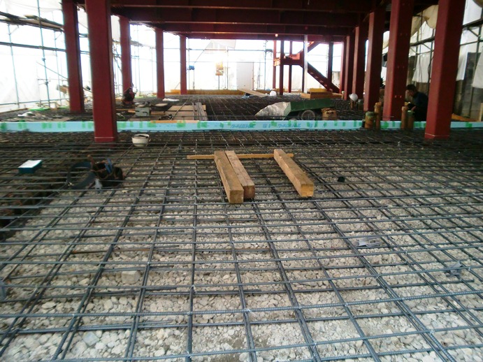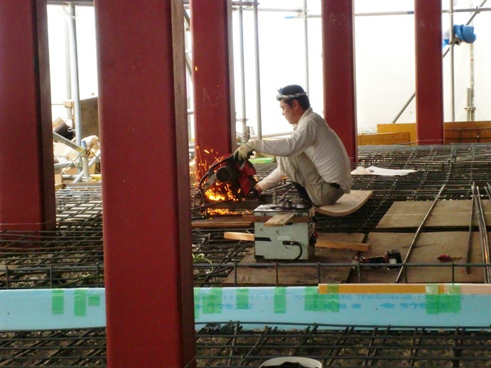 1階の床、配筋中 2012年9月27日(木) 明日、1階床のコンクリート打設を控え、職人さんたちがもくもくと配筋作業をおこなっていました。ときおり、花火のように上階の溶接の火花が散って、私はびくびくです。 配筋に使う鉄筋を切っています。。 目黒区洗足マンション一覧に戻る 前の記事へ 次の記事へ 最新の投稿 目黒区I邸 断熱吹付け工事 目黒区A邸 ベタ基礎完成 目黒区A邸AP 基礎コンクリート打設完了 目黒区A邸AP 鉄骨土台施工 目黒区A邸 べた基礎耐圧板 コンクリート打設工事