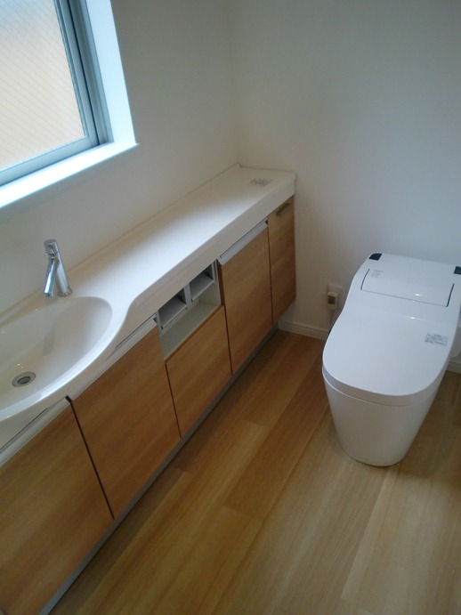 2階トイレ こちらはスタッフ用。シンプル&ナチュラル。床はフローリングのように見えますが、これは木目プリントの塩ビタイルなんです。一見全然わかりません!