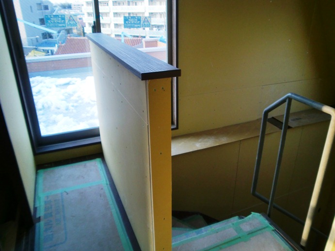 階段を上がると各所に大きな開口があり、光がさんさんと入ってきます。まだ先日の雪がのこっています。。