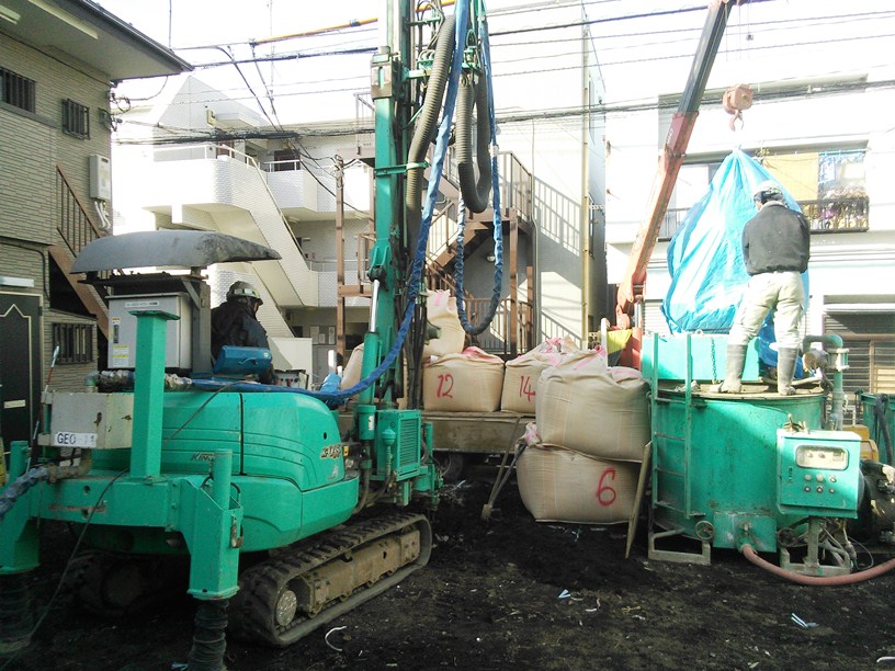 地盤改良を行いました 2013年3月4日(月) こちらの土地は柱状地盤改良方式を採用しています。通常、支持層が表層から8メートル以下の深さにある場合に用いられる方式です。良好地盤まで掘削してセメントミルクを流し込み、柱状に地盤を固める方法です。 袋に入ってるのはセメント固形材です。これを現場で練り、ホースで掘削機械のドリルに送りこみます。ドリルは堀りながらセメントミルクを吐出していきます。ドリルが引き上げられるときに、固形材が撹拌・混合されます。 新宿区K邸共同住宅一覧に戻る 前の記事へ 次の記事へ 最新の投稿 目黒区I邸 断熱吹付け工事 目黒区A邸 ベタ基礎完成 目黒区A邸 べた基礎耐圧板 コンクリート打設工事 目黒区A邸 べた基礎配筋工事 目黒区I邸賃貸併用住宅 バルコニー防水工事