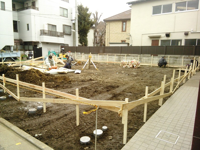 敷地のまわりに杭を打ち、一定の高さを決めて貫板をめぐらします。