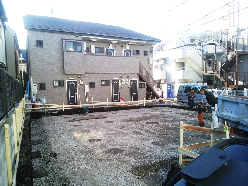 基礎の高さに砕石を敷き、転圧をかけて固めます。地盤改良を行ったセメントの柱の頭がみえるようになりました。