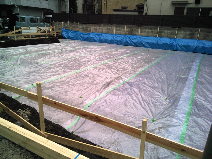 転圧完了後、防湿シートを施工。この上に墨きりを行うため捨コンを流します。