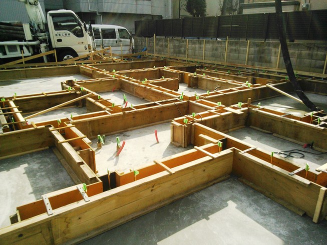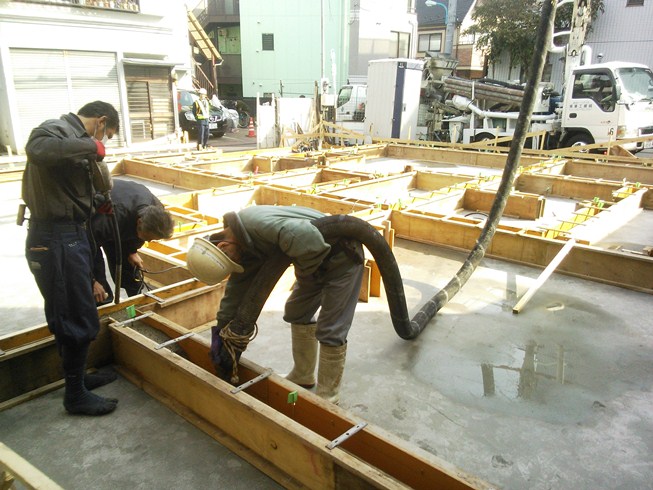 基礎立ち上がり 2013年3月4日(月) 次は基礎の立ち上がり部分のコンクリート打設です。型枠を組み立てます。 型枠工事完了 生コンクリート打設工事の際には毎回コンクリートスランプ試験を行います。生コン車が到着すると、まず、コンクリートを検査用に採取し、適切な流動性があるか確認します。 コンクリート流し込み中 コンクリートの表面を丁寧にこてで均していきます。 新宿区K邸共同住宅一覧に戻る 前の記事へ 次の記事へ 最新の投稿 目黒区I邸 断熱吹付け工事 目黒区A邸 ベタ基礎完成 目黒区A邸AP 基礎コンクリート打設完了 目黒区A邸AP 鉄骨土台施工 目黒区A邸 べた基礎耐圧板 コンクリート打設工事