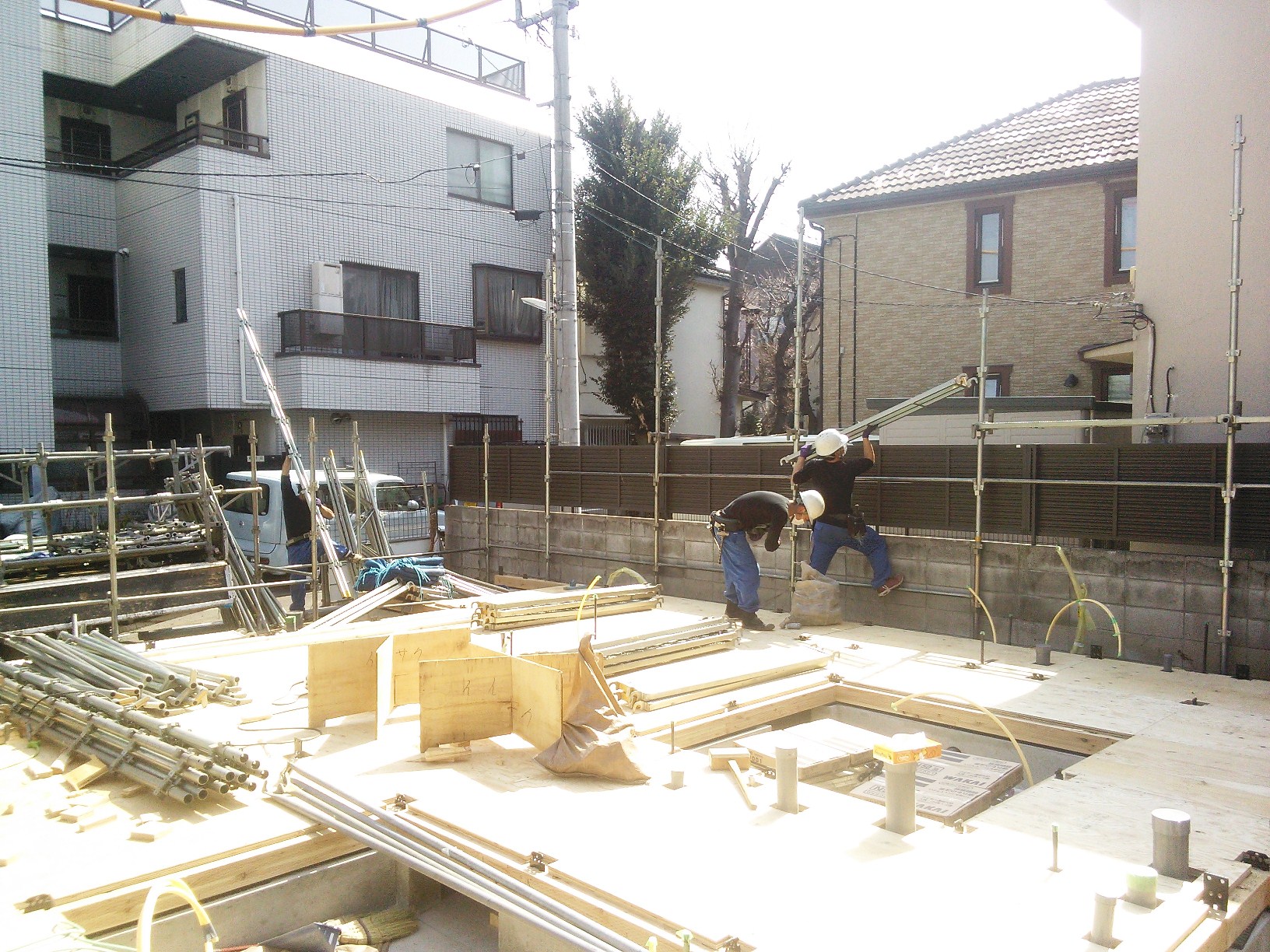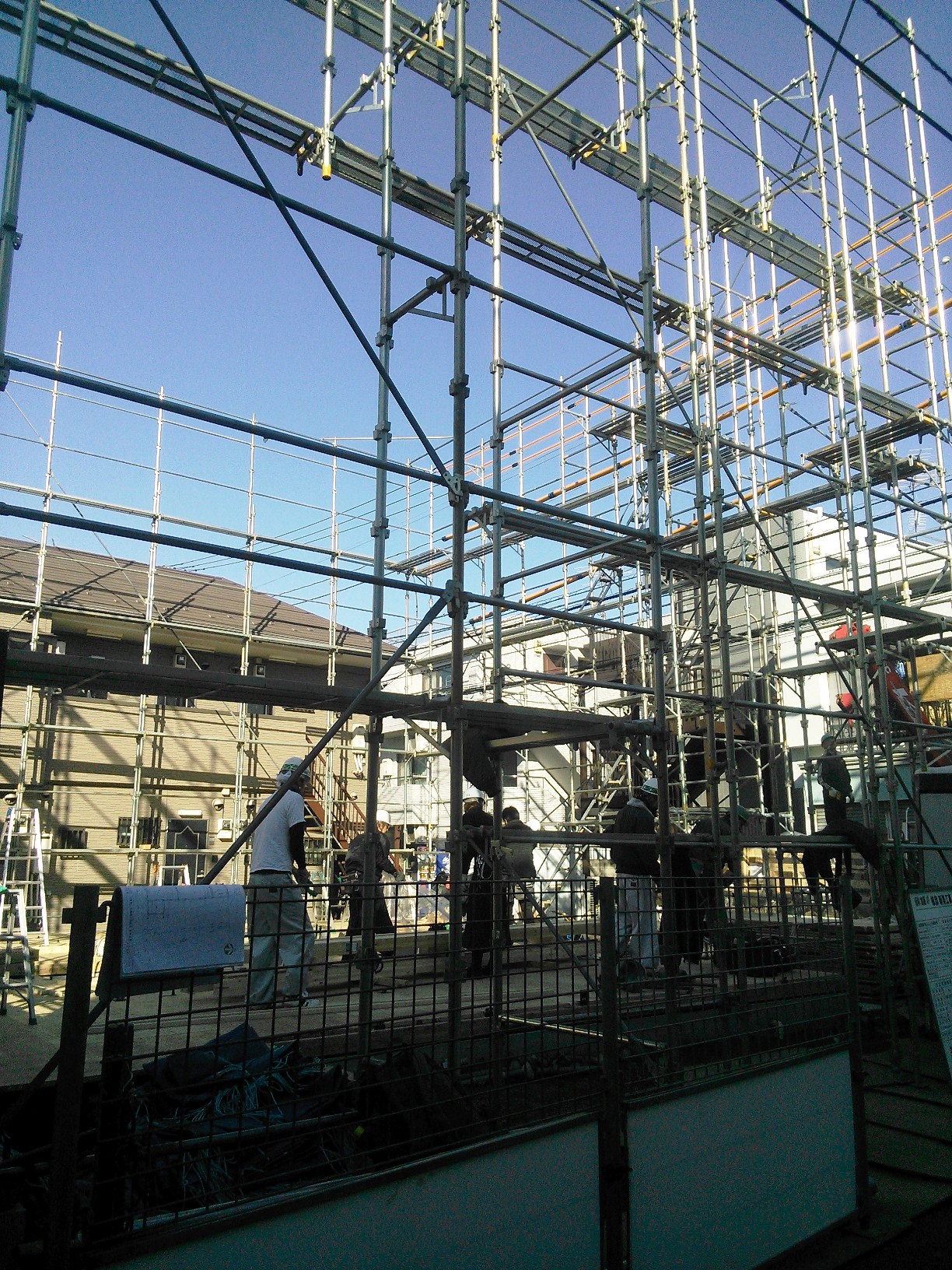 足場工事 2013年3月14日(木) 上棟にむけて建物周囲に足場を組み始めました。 さすがに大きな建物なので足場たてにも3日弱かかりました。翌日の上棟を前に足場組み完了です。 新宿区K邸共同住宅一覧に戻る 前の記事へ 次の記事へ 最新の投稿 目黒区A邸 地鎮祭 目黒区A邸AP 地盤改良杭工事 目黒区I邸 基礎立ち上がり打設完了 目黒区I邸 配筋工事 品川区M邸 解体完了しました