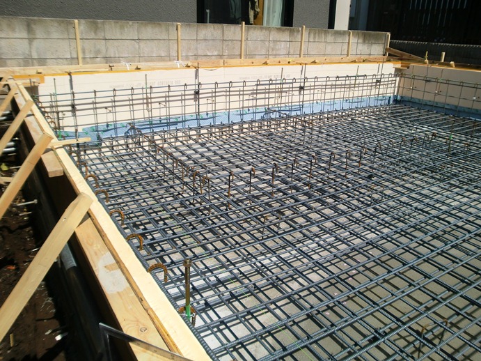 配筋検査完了 2013年4月23日(火) 朝イチで配筋検査完了。いよいよ耐圧盤コンクリートの流し込みです。こちらの現場では基礎が地面に少しもぐるため、基礎の立ち上がり部分とのつなぎ目から水が侵入しないように基礎の高さにゴム製の止水板が施工されています。 品川区小山K邸一覧に戻る 前の記事へ 次の記事へ 最新の投稿 目黒区I邸 断熱吹付け工事 目黒区A邸 ベタ基礎完成 目黒区A邸 べた基礎耐圧板 コンクリート打設工事 目黒区A邸 べた基礎配筋工事 目黒区I邸賃貸併用住宅 バルコニー防水工事