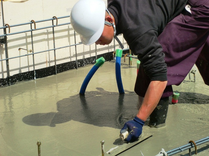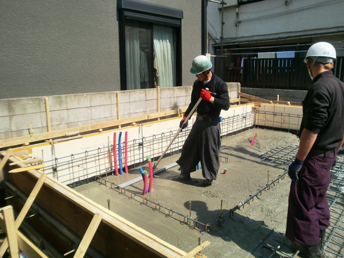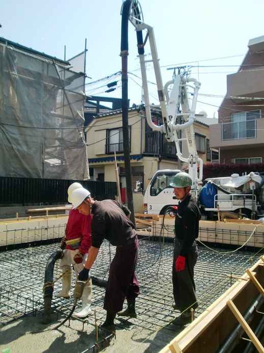 耐圧コンクリート打設 2013年4月23日(火) 今日は耐圧盤のコンクリート流し込みです。道路が狭く、小型のミキサー車しかはいれないので、生コンは6回くらいにわけて運搬されてきます。ミキサー車からコンクリート圧送車に移され、圧送車の長いアームに取り付けられているホースで流し込みが行われます。流し込むそばから、バイブレータで締固めます。 トンボで表面を均して さらに金鏝で表面を滑らかにしていきます。 品川区小山K邸一覧に戻る 前の記事へ 次の記事へ 最新の投稿 目黒区M邸 完成お引渡し 目黒区M邸 内装工事がほぼ完了 レンガの家西小山 完成間近です 目黒区M邸 内装工事 目黒区M邸 断熱吹付け完了です