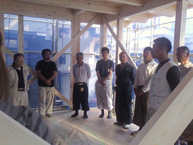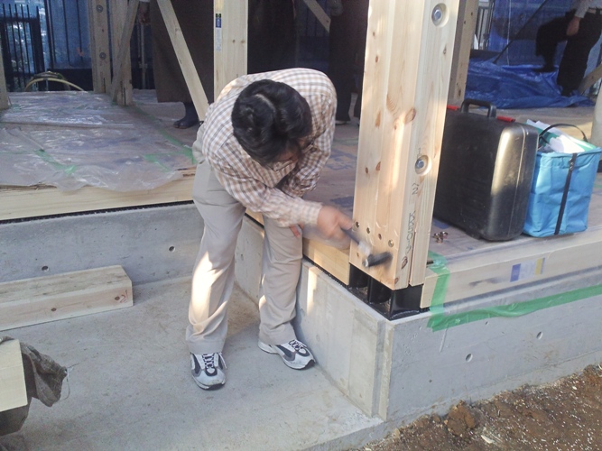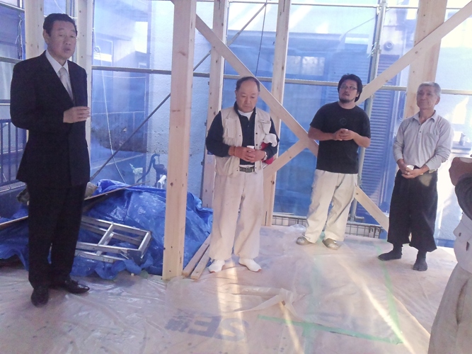 上棟式 2012年5月21日(月) 竣工後の無事を祈願して、夕方からとり行われた上棟式の様子です。 社長の隣にいらっしゃる施主様よりごあいさつをいただいています。 施主様の手でドリフトピンを打ち込んでいただきました。 品川区荏原K邸一覧に戻る 前の記事へ 次の記事へ 最新の投稿 目黒区I邸 断熱吹付け工事 目黒区A邸 ベタ基礎完成 目黒区A邸 べた基礎耐圧板 コンクリート打設工事 目黒区A邸 べた基礎配筋工事 目黒区I邸賃貸併用住宅 バルコニー防水工事